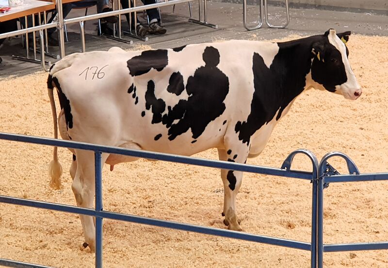 Das Angebot am Deckbullenmarkt war mit 11 aufgetriebenen und verbandsanerkannten Bullen sehr überschaubar. Die Qualität der Bullen konnte aber in der Breite absolut überzeugen und hielt für die verschiedenen Käuferwünsche etwas Passendes bereit. Mit einem Durchschnittspreis von 2.964 € wurde das Vormonatsergebnis zwar nicht ganz erzielt, dennoch sorgte der ein oder andere Bieterwettstreit für Aufsehen. Insbesondere als die Katalognummer 11, KOE Spontan, ein reinerbig hornloser Spy P-Sohn aus der Zucht der Köster KG aus Steinfurt den Ring betrat, ging es hoch her. Denn KOE Spontan bot ein absolut komplettes Paket für einen Deckbullen: Hornlosigkeit in reinerbiger Form, Zuchtwerte auf Besamungsbullenniveau mit 153 gRZG und 2.804 RZ€, eine exterieur- und leistungsstarke Kuhfamilie mit besten Eiweißgehalten und dazu noch ein tadelloses eigenes Erscheinungsbild – was will man mehr? Logischerweise war die Konkurrenz um diesen hoch interessanten Bullen groß. Und so schnellten die Gebote nur so in die Höhe, bevor einem Züchter aus dem Saarland zum Gebot von 5.900 € der Zuschlag erteilt wurde und der Bulle unter Applaus aus dem Ring geführt wurde. Mit deutlichem Abstand aber ebenfalls zu einem Spitzenpreis von 3.500 € folgte ein Redford-Sohn aus der Zucht von Ludger Tißen aus Kleve. Ein Kuhstamm der für Langlebigkeit mit besten Leistungen und hervorragenden Inhaltsstoffgehalten sowie exzellentes Exterieur mit Schauerfahrung steht waren neben dem korrekten Bullen selbst sicherlich Gründe für einen Züchter aus dem Kreis Olpe sich diesen gerade ein Jahr alten Bullen zu sichern. Aus dem gleichen Zuchtbetrieb stammte ein natürlich hornloser Sea P-Sohn, der für 3.100 € im Zuschlag in den Kreis Coesfeld wechselte. Den gleichen Preis erzielte ein Remedy-Sohn aus der Zucht von Ludger Wiewer aus Drensteinfurt, der über vier Generationen exzellente Kühe im Kuhstamm auf die bekannte Stammkuh WR Morelle EX93 zurückgeht und zukünftig in Baden-Württemberg zum Deckeinsatz kommen wird.
