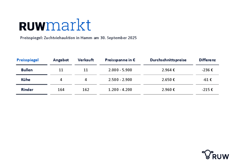Die nächste Zuchtviehversteigerung der Rinder- Union West eG in Hamm findet am Dienstag, 28. Oktober 2025, statt. Auktionskataloge können bei der RUW unter 0251/9288-226 angefordert werden und stehen unter www.ruweg.de zum Download bereit.
