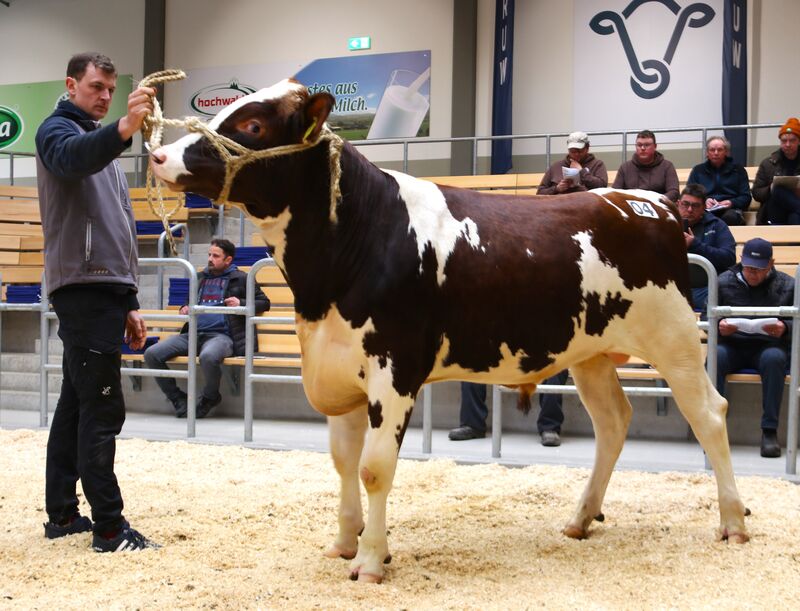 Das wird in Erinnerung bleiben: SfH Superstar von Simply Red, aus der Zucht der Seidenfaden GbR aus Mechernich, wird für 6.300 € verkauft! Doch der Reihe nach: Mit seinem Pedigree, Simply Red x Rammstein x Renegade, entspringt dieser Bulle einer bedeutenden Kuhfamilie der Seidenfadens. Hinzu kommen die sehr hohen Zuchtwerte und sein rotbuntes Fell, die ihn so wertvoll machen. Er zeigte sich im Ring sehr gut entwickelt ohne jegliche Fehler. Bereits im Vorfeld hatten sich zahlreiche Interessenten gemeldet. Bei einem spannenden Bieterduell viel der Hammer für eine deutsche Besamungsstation. Vom Exterieur her bester Bulle der Versteigerung stammt aus der Zucht von Elmar Mettel aus Mettendorf. Der tiefschwarz gezeichnete SIMON P-Sohn hat eine 89-Punkte FERRARI-Mutter und STADEL-Großmutter, mit viel Milch und hohen Inhaltsstoffen. Er kommt für 4.200 € im Westerwald zum Deckeinsatz. Hugo Berners aus Simmerath erlöste für seinen eleganten, hornlosen Always PP-Sohn aus seinem bekannten T-Stamm 3.000 €. Er bleibt in der Eifel.