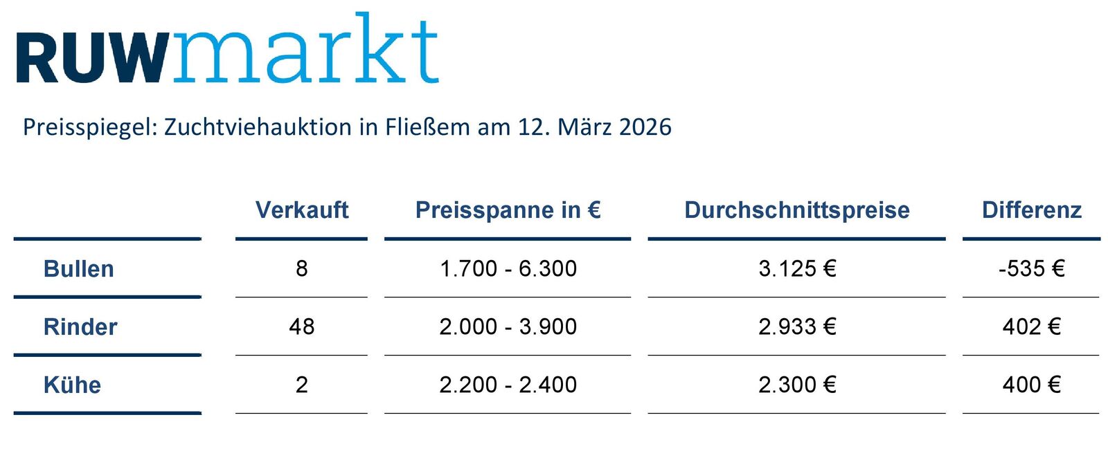 Die nächste Zuchtviehauktion der RUW in Fließem findet am Donnerstag, den 9. April 2026, statt. Anmeldungen für diese Auktion sollten bis Montag, den 30. März 2026, im RUW-Regionalzentrum in Fließem vorliegen und werden unter Tel. 06569 969020, per Fax 06569 969099 oder per Mail mmertes@ruweg.de gerne entgegen genommen.