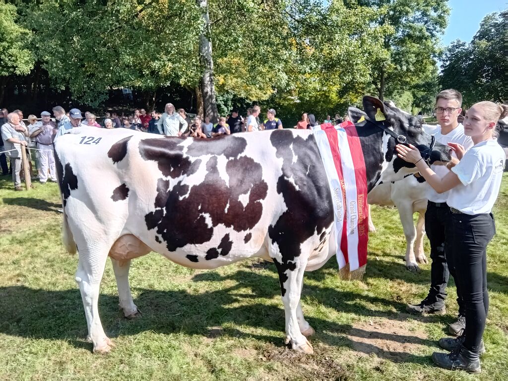 Die letzte Entscheidung des Tages wurde mit Spannung erwartet – die Wahl zur Miss Olpe (Grand Champion). Hierzu stellten Carina Nölker und Hendrik Albers die einzelnen Siegerkühe in einer Reihe auf (Lineup) und entschied sich für die Kat.-Nr.124, die Lambda-Tochter Amira, eine gute mittelrahmige, im korrekten und ausbalancierten Körper, idealem Beinwerk und einem fest, hoch und mit einer starken Textur versehendem Euter. Ein Riesenerfolg für den Züchter und Besitzer Martin Voß mit seiner Familie.