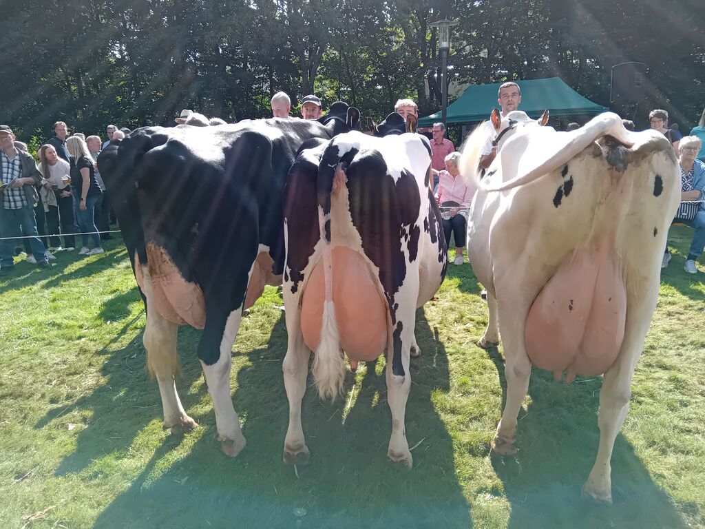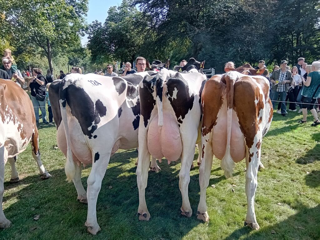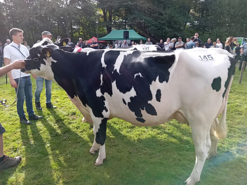 Die nächsten Klassen, den Kühen mit zwei und drei Kälbern, zeigten klar das Zuchtziel der Deutschen Holstein – Kühe mit ordentlichen Rahmen, mit ausbalancierten Körpern, korrekten Fundamenten und hoch, festansitzenden Eutern, die eine hohe Nutzungsdauer garantieren. In der ersten Klasse gewann die Kat.-Nr. 128 Mara, eine Barclay Tochter mit einem sehr drüsigen Euter vom Katharina Funke-Heinert aus Lennestadt-Altenvalbert vor der schneeweißen, typstarken und mit einem sehr langem Vordereuter versehenen Kat.-Nr. 132 Genius Tochter Klara von Michael Weber aus Kirchhundem-Kruberg. In der zweiten Klasse sicherte sich die kompletteste Kuh der Gruppe, die Lambda-Tochter Amira, Kat.-Nr. 124 von der Voß-Burbecke GbR aus Lennestadt-Burbecke, den 1a Preis vor ihrer rotbunten Stallgefährtin Jetta, eine Solito Red-Tochter, die durch ihren feinen Milchtyp, mit bestem Euter und idealer Beckenlage bestechen konnte. In der dritten Klasse sicherte sich die dreikalbige Kat.-Nr. 116 Tessa, eine Chief-Tochter ebenfalls von der Voß-Burbecke Gbr den 1a Preis, vor der zweitplatzierten Carenzo-Tochter Dorint, Kat.-Nr. 119 von Georg Geuecke. Siegerkuh der Mittleren Klassen wurde die beste Euterkuh der Schau, Kat.-Nr.124 die Lambda- Tochter Amira vor ihrer Stallgenossin Jetta, Kat.-Nr. 122. Ein riesiger Erfolg für die Züchterfamilie Martin und Heinz Voß aus Burbecke.