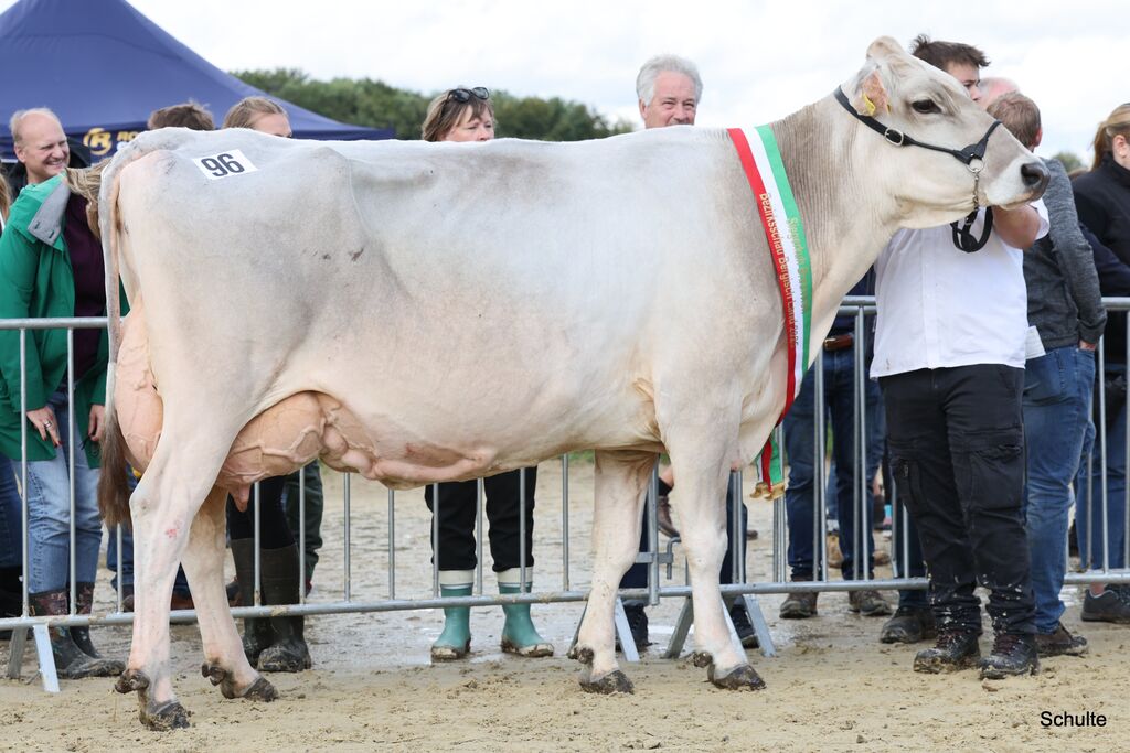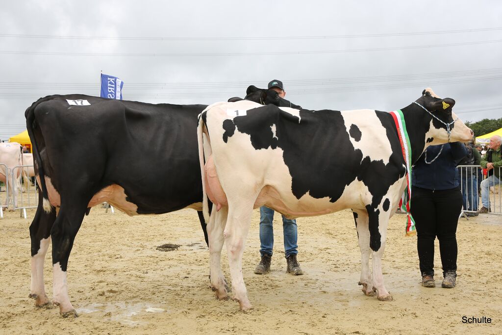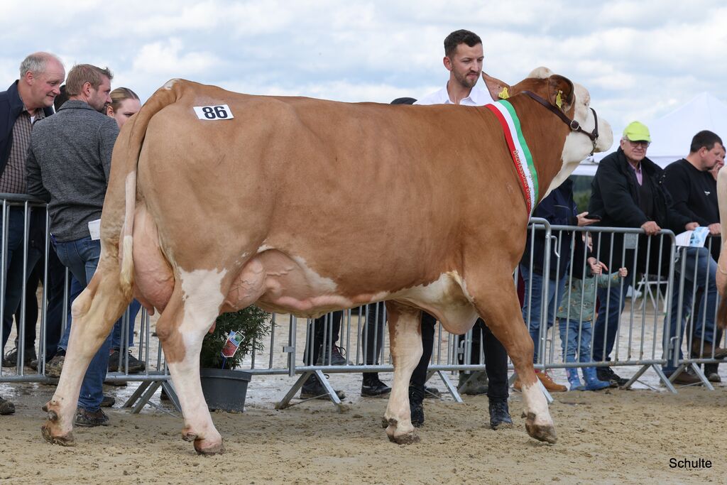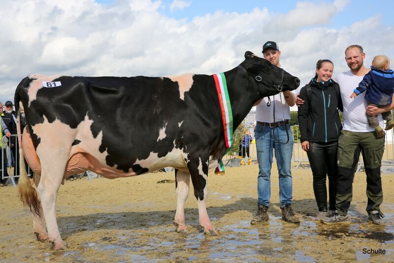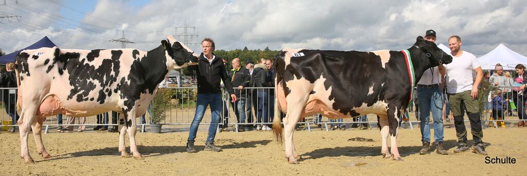 Ein überragendes Bild aus zehn Zweit- und Drittkalbskühen bot sich dem Publikum und den Preisrichtern nach den nächsten Klassen zur Siegerauswahl Holstein jung: Drei Ia-Kühe von Bernd Lohmann, die Sidekick-Tochter Rollsroyce, die Barolo-Tochter Beyonce und die Goldchip-Tochter Elayne, maßen sich mit der Mirand PP-Tochter KFV Charity von Kaufmann, Much und der Ronald-Tochter AHZ Amie von Mickenhagen. Aber auch die fünf Ib-Kühe der jungen Klassen hatten sehr viel Qualität: Gleich dreimal war es Peter Winter, Wuppertal, mit der Handsome-Tochter HZW Goldfee, der Ronald-Tochter HZW Enie und der Reflector-Tochter HZW Ernte sowie die Lüpschen GbR mit der Lambda-Tochter HAM Shiver und Dirk vom Stein, Wermelskirchen, mit der Mirand PP-Tochter WIT Bounty. Was für ein Line-Up! Hier gewann dann Bernd Lohmann mit der sehr funktionellen und dennoch mit enormem Schautyp ausgestatteten Barolo-Tochter Beyonce. Ihr Mehr an Kaliber platzierte sie vor der Ronald-Tochter AHZ Amie von Marco Mickenhagen, deren enorme Euterhöhe, Euterbreite und Lebhaftigkeit sie auf den Reservesiegerrang brachte. Der Kommentar eines Besuchers am Ring sagte alles zu diesen zehn Kühen: „Da ist keine Kuh im Ring, die nicht auf die RUW-Schau gehört!“