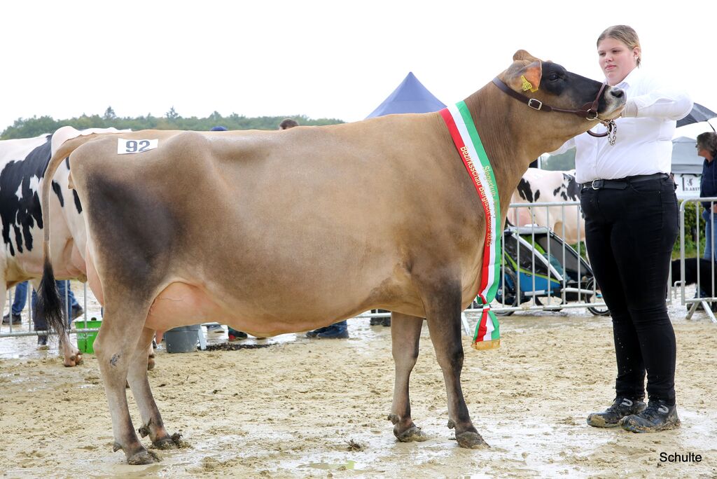 Das Bergische Land hat neben Holsteins auch noch einige andere Milchvieh-Rassen zu bieten, so dass auch die beste Fleckvieh-Kuh der Schau, die Vollkommen-Tochter KFV Web P der BG Kollenberg/Kaufmann, die beste Jerseykuh, die Joel-Tochter Marvelous der Dierdorf GbR und die beste Braunvieh-Kuh, die Bender-Tochter Nyala der Kollenberg GbR mit in die Entscheidung um den Titel Miss Bergisch Land eingreifen durften. Hierzu waren ebenfalls die drei Siegerkühe Holstein in den Ring einmarschiert. Der Titel ging dann aber unter einem Riesenapplaus des Publikums an die alte Siegerkuh der Holsteins, die Laurent P-Tochter Lennya der Kohlgrüber GbR.