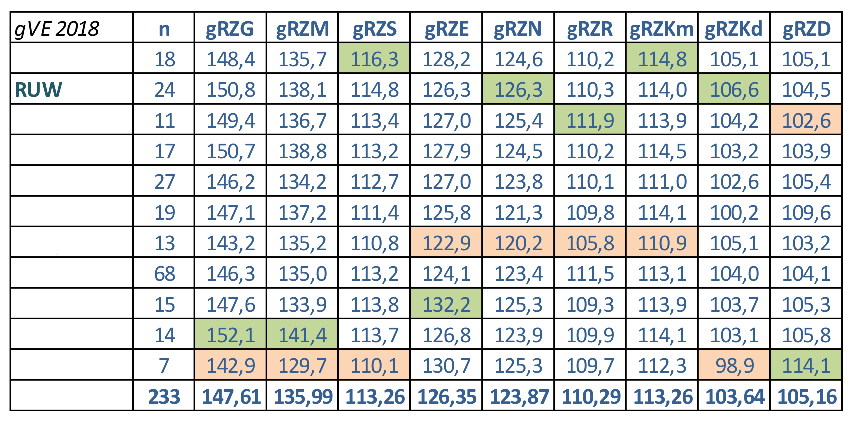 Ausgewertet wurden alle erstmals im Kalenderjahr 2018 in Deutschland eingesetzten Jungbullen (Datenstand: August-ZWS 2018). Die 24 eingesetzten SBT-Bullen der RUW hatten im Durchschnitt einen gRZG von 150,8 und liegen damit 3,2 Punkte über dem bundesweiten Durchschnitt. Mit einem durchschnittlichen gRZG von 147,0 sind die 12 eingesetzten RBT-Bullen der RUW um 2,1 Punkte über dem bundesweiten Durchschnitt. (Verbände mit 2 Bullen oder weniger pro Jahr wurden hier vom Ranking ausgenommen).