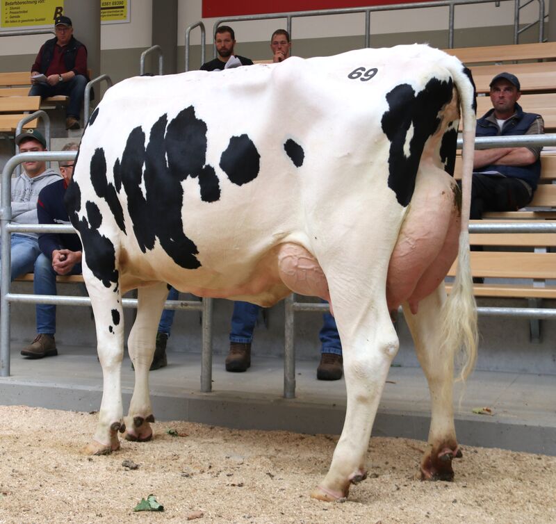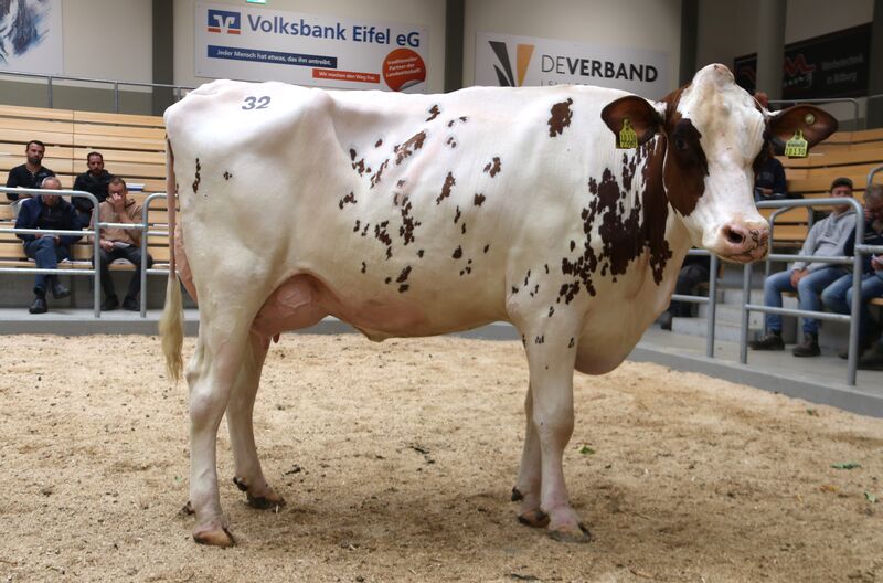 Ungebrochen ist das große Kaufinteresse an reinerbig hornlosen Bullen. Wenn dann noch eine Kuhfamilie dahintersteckt, die Besamungsbullen geliefert hat und liefert, ist die Nachfrage garantiert. Beim Spitzenreiter der Bullen war es PM Rainbow, der Meuteshof eGbR aus Rommersheim den alle wollten. Der tiefe A-Stamm ist mit hohen Exterieur Noten besetzt und leistet sehr viel Milch. Für 4.600 € erhielt ein luxemburgen Züchter den Zuschlag. Von großem Interesse war auch ein Bulle der Rasse Braunvieh, aus der Zucht Nohner eGbR aus Sassem. Dieser starke Decapo-Sohn reist für 3.600 € nach Belgien.