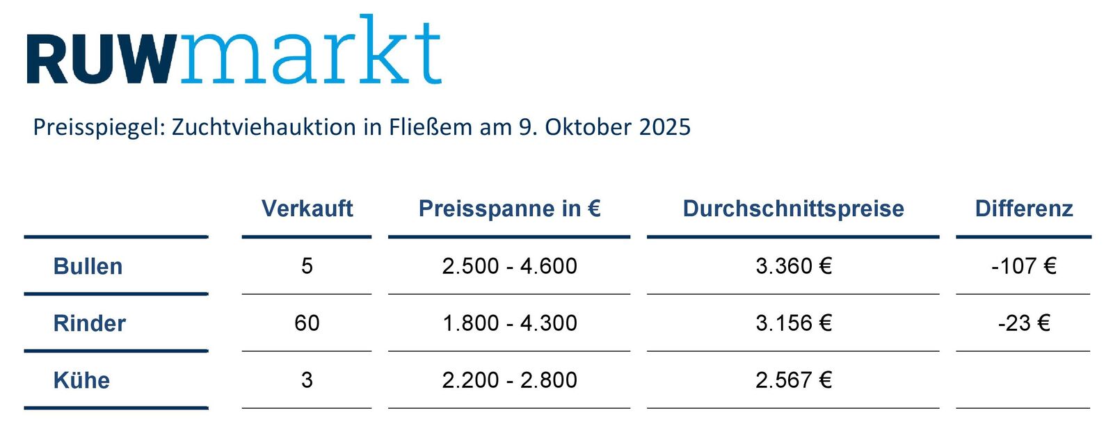 Die nächste Zuchtviehauktion der RUW findet am Donnerstag, den 13. November 2025 statt. Anmeldungen für diese Auktion sollten bis Montag, den 27. Oktober 2025 im RUW-Regionalzentrum in Fließem vorliegen und werden unter Tel. 06569 9690-20, per Fax 06569 9690-99 oder per E-Mail mmertes@ruweg.de gerne aufgenommen.