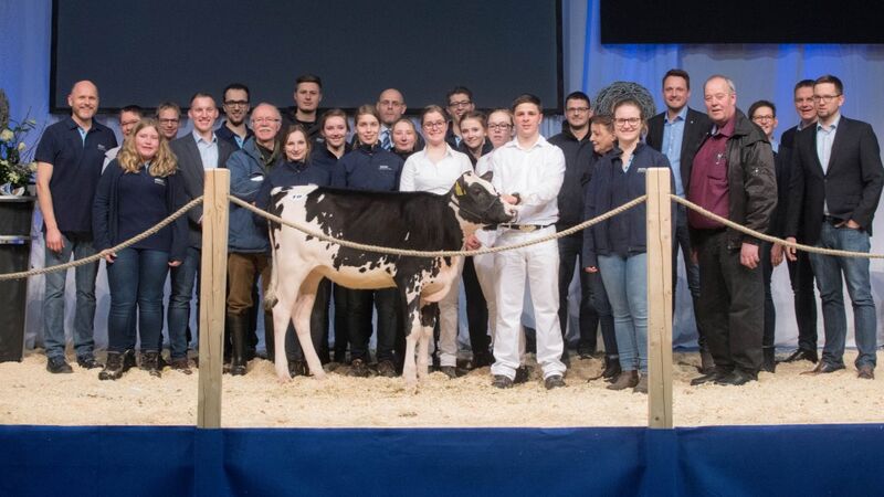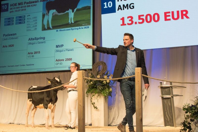 Das Publikum war bereits in bester Laune als Dolce Vita mit der Katalognummer 19 auf die Bühne geführt wurde. Dolce Vita ist die höchste Hartley-Tochter auf RZG-Basis und überzeugte neben einem gRZG von 163 mit einem absolut ausgeglichenen Zuchtwertprofil mit Topwerten für Leistung und Nutzungsdauer. Sie stammt aus der legendären Miss Mark Maui EX-95-Dynastie und wurde von Alois Loddenkemper aus Drensteinfurt zum Verkauf angeboten. Die Kataloge flogen nur so in die Höhe und ließen den Steigpreis schnell auf über 20.000 € klettern. Der Hammer senkte sich beim Gebot von 26.000 € und Dolce Vita verließ begleitet vom Applaus des Publikums die Bühne. Von Hans Hurkmans aus den Niederlanden wurde HET Cosmo zum Verkauf angeboten. Diese PACE RED-Tochter ist mit gRZG 159 eines der höchsten spülfähigen Rotfaktor-Tiere. Sie geht zurück auf die Kuhfamilie der herausragenden Zuchtkühe Larcrest Cosmopolitan VG-87 und Larcrest Crimson EX-94. Ein Züchter aus dem Kreis Borken sicherte sich den Zuschlag mit dem Gebot von 15.000 €. Knapp dahinter platzierte sich HOE MS Padawan AMG, eine Padawan-Tochter aus der Gold-N-Oaks Shottle Marbella-Familie. Sie wurde von Hoeven Holsteins aus Haselünne angeboten und begeisterte mit Topzuchtwerten in nahezu allen Zuchtwertsystemen. Mit dem Gebot von 13.500 € ging der Zuschlag an einen Züchter im Kreis Kleve. Die Kategorie der Jungrinder erzielten im Durchschnitt 7.842 €.
