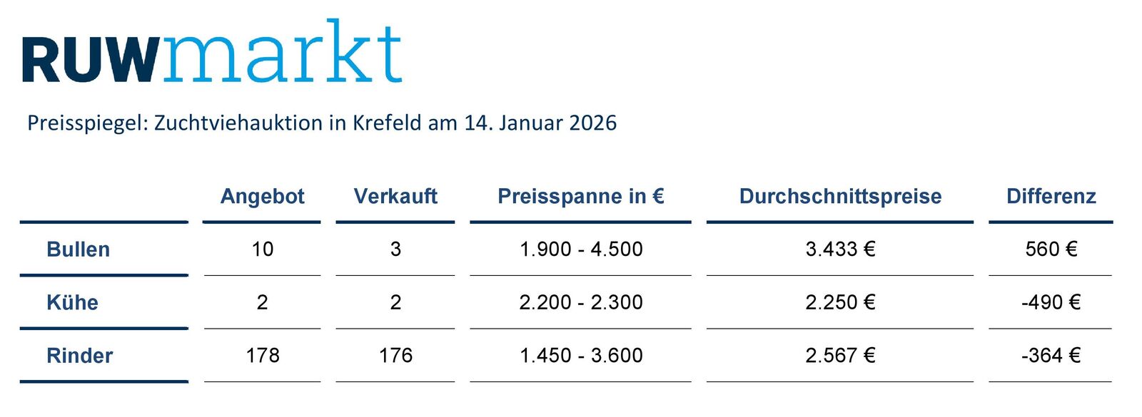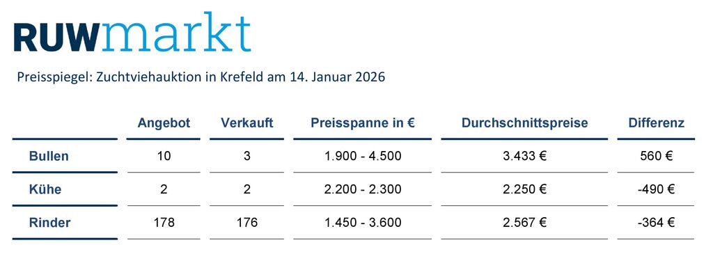 Die nächste RUW-Zuchtviehauktion in Krefeld findet am 11. Februar 2026 statt.Anmeldungen für diese Auktion sollten bis Freitag, den 23. Januar 2026, im RUW-Regionalzentrum in Krefeld vorliegen und werden unter Tel. 02151 8189914, per Fax 02151 8189966 oder per Mail aleuchten@ruweg.de entgegengenommen. Für einen reibungslosen Ablauf bitten wir um Einhaltung der Anmeldefrist.