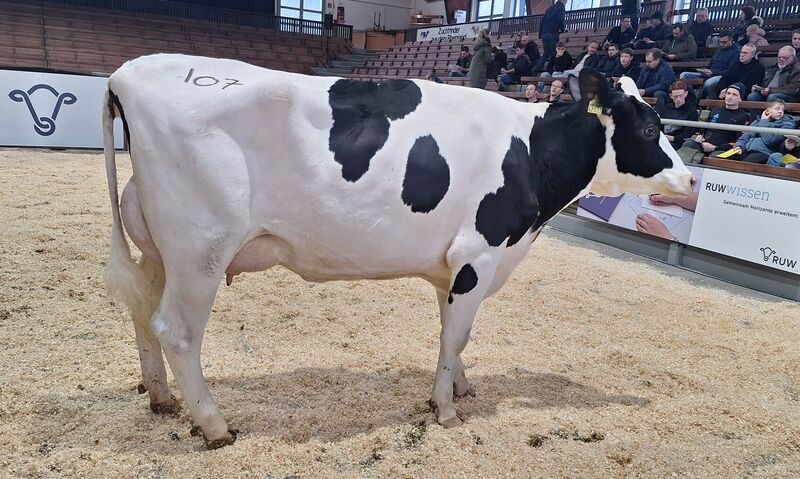 Bei den Remontierungsfärsen stiegen die Zuschlagspreise im Laufe der Auktion weiter an. Das erste Gebot über 3.000 € erzielte Geord Daamen aus Bedburg- Hau mit einer MONEY P-Tochter, die bereits 38 kg Milch Tagesgemelk vorzuweisen hat. Für 3.200 € wechselt diese tolle Färse in den Kreis Wesel. Ein belgischer Stammkunde sicherte sich für 3.400 € die Glamour-Tochter von Wilhelm van Heek aus Kleve. In die Städteregion Aachen wechselt eine der hervorragenden SHOUT RDC-Töchter der Auktion. Die Katalognummer 109, vorgestellt von Rainer Thoenes, Kalkar, war ihrem neuen Besitzer 3.500 € wert. Eine körperlich sehr gut entwickelte Drone PP- Tochter aus dem Zuchtbetrieb Volker Elsermann, Hamminkeln, erlöste 3.500€. Mit einer Leistung von 36 kg Milch melkt sie zukünftig in einem belgischen Stall. Kurz darauf folgte eine lackschwarze Tochter des Bullen Migel von der Hubert Peerenboom GbR aus Kalkar. Mit einer beeindruckenden Tagesleistung von 40 kg Milch wechselt sie für 2.800 € in den Kreis Viersen. In den gleichen Kreis konnte die Nummer 166, eine SPREAD P-Tochter von Rudolf van Hal aus Isselburg zugeschlagen werden. Die aktuelle Leistung von 37 kg Milch entlockte dem Käufer ein Gebot von 3.300 €. Im Anschluss stellte Willi Achten aus Kempen eine EL TORO-Tochter im Ring vor, die aktuell 44 kg Milch Tagesleistung vorweisen kann. Diese bunt gezeichnete rotbunte Färse wurde für 3.300 € zugeschlagen. Den höchsten Zuschlag von 3.600 € erhielt Ludger Sondermann für eine Tochter des bekannten RUW-Bullen ARIZONA. Mit ihrer enormen Tagesleistung von 43 kg Milch wechselte diese körper- und euterstarke Färse in einen Zuchtbetrieb im Kreis Wesel. Eine weitere SHOUT RDC-Tochter präsentierte Ludger Tißen aus Kleve mit der Katalognummer 209. Ein hervorragendes Fundament und ideale Strichplatzierung überzeugten einen belgischen Kunden davon, bis 3.200 € zu bieten. Kurz vor dem Ende der Auktion stellte die Luehlshof KG eine Mask Red-Tochter zum Verkauf. Nebe der guten Einstufung der Mutter von 86 Punkten glänzte sie selbst mit einer hohen Tagesleistung von 41 kg Milch. Der Hammer fiel für dieses dunkelrote Laufstallrind bei 3.300 €.