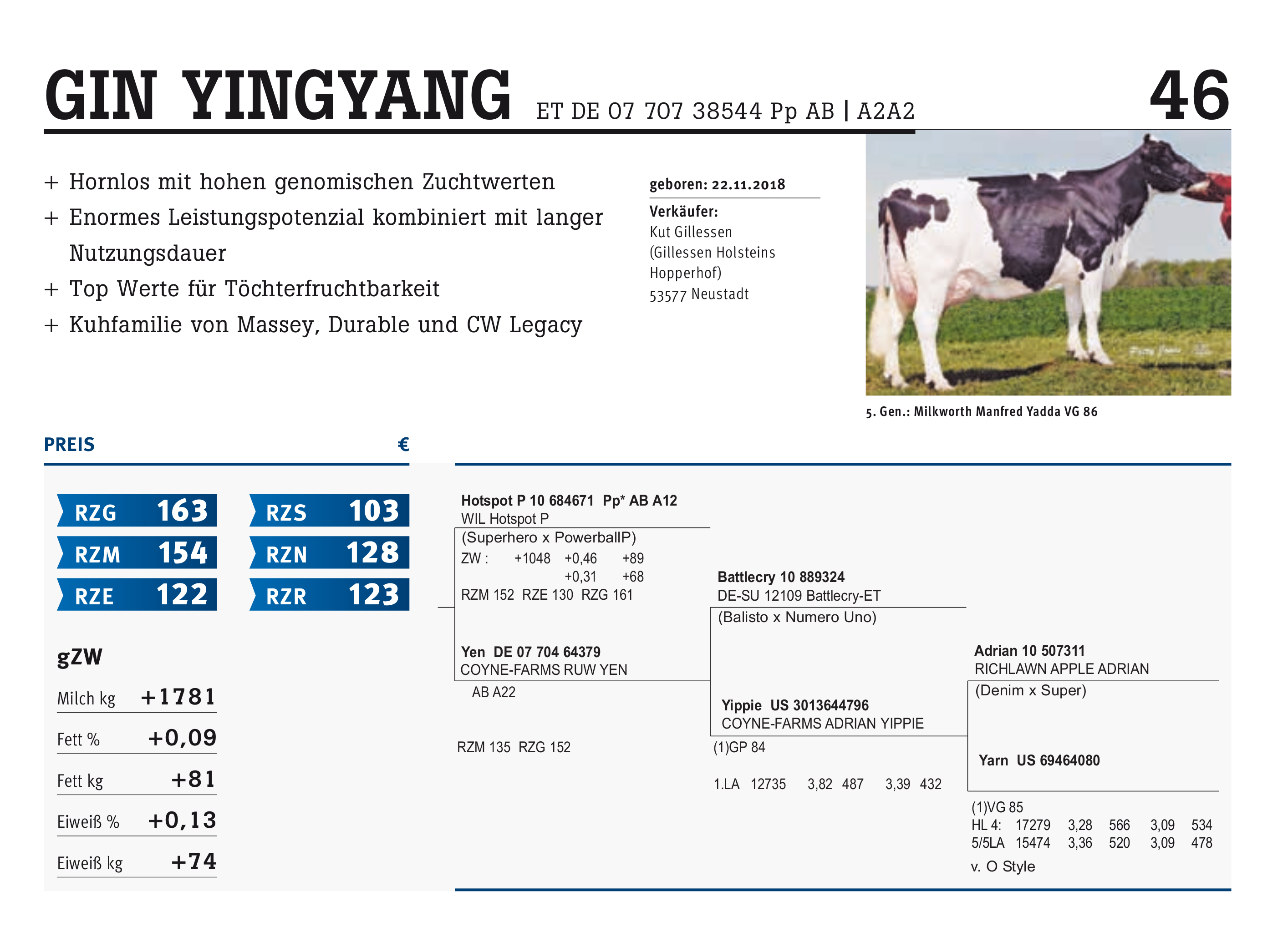 Mit GIN YINGYANG ET P bieten wir eine hornlose HOTSPOT P-Tochter mit hohen genomischen Zuchtwerten an.