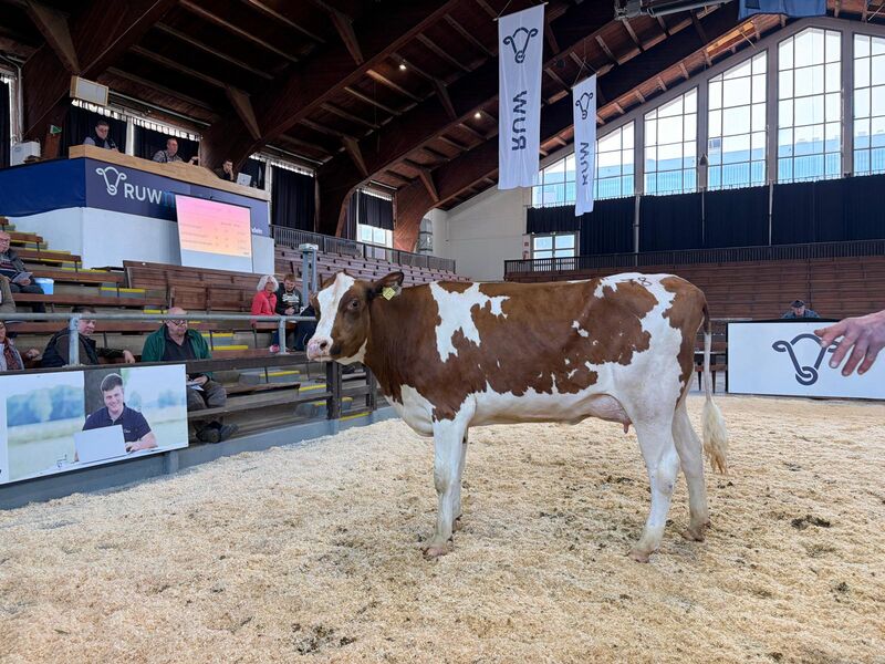 Den Topseller der neun vorgestellten Deckbullen stellte Manfred Robert aus Vreden. Sein gerade erst ein Jahr alt gewordener reinerbig hornloser Mo Red PP-Sohn, der mütterlicherseits auf die Linie des beliebten RUW-Vererbers SESSION zurück geht, präsentierte sich äußerst gelassen und bestens entwickelt im Ring. Der zudem mit guten genomischen Zuchtwerten ausgestattete Rotbunte war einem Züchter aus Luxemburg stolze 5.200 € wert.