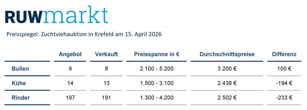 Die nächste Zuchtviehauktion der Rinder-Union West eG in Krefeld findet am 20. Mai 2026 statt. Anmeldungen für diese Auktion sollten bis Donnerstag, den 30. April 2026, im RUW-Regionalzentrum in Krefeld vorliegen und werden unter Tel. 0215181899-14, per Fax 02151 81899-66 oder per Mail aleuchten@ruweg.de entgegengenommen. Für einen reibungslosen Ablauf bitten wir um Einhaltung der Anmeldefrist.