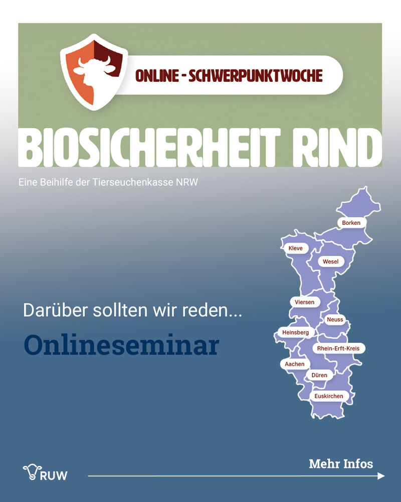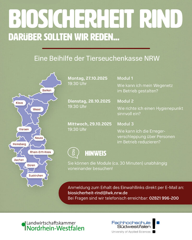 Schreiben Sie einfach eine kurze E-Mail an biosicherheit-rind@lwk.nrw.deund erhalten Sie Ihren persönlichen Einwahllink.