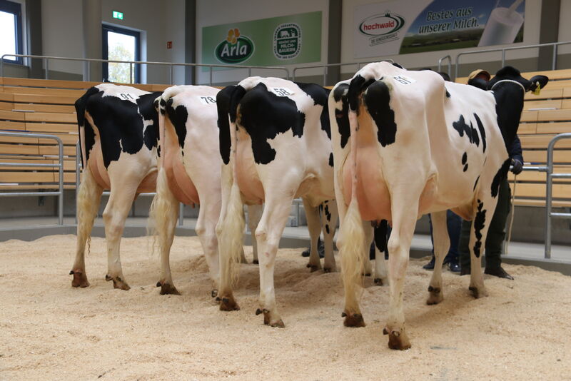 Die Kaufinteressenten waren früh in den Stallungen, um das Angebot genau in Augenschein zu nehmen. Und wie immer häufiger zu sehen wurde der ein oder andere Videoclip gedreht, um den Kunden die Tiere hautnah zu zeigen. Einige Holsteinfärsen stachen besonders hervor, was die Preise im Ring beweisen sollten. Peter Meutes aus Rommersheim war mit einem starken Kontingent von 9 Rindern in Fließem angetreten. Er stellte mit PM Celina den Preissieger mit 3.800 €. Diese Fon Doo-Färse hatte eine großartige Ausstrahlung mit sehr viel Typ und einem fest angesetzten Euter. Mit 3.700 € stammt auch PM Norma aus demselben Stall. Eine Swingman x Salve x Goldwin aus einer ganz tiefen Kuhfamilie, die in ihrer Erscheinung keine Wünsche offenließ. PM Romida verließ den Ring mit 3.400 €. Diese elegante Soundcloud -Tochter hat viele Generationen mit mehr als 13.000 kg Milch im Stammbaum. Vierte Färse im Hochpreisbereich aus diesem Zuchtstall war die gerade 24 Monate alte Ferrari-Tochter PM Frauke, für die der Hammer bei 3.100 € fiel. Jung, nicht so groß, sehr harmonisch und 36 kg Milch in der Kontrolle – typisch für den Altmeister RUR Ferrari! Auch RUW Barbados ist den Liebhabern problemloser Färsen ein Begriff. Eine solche kommt von der Merz GbR aus Bauler und brachte 3.300 € im Zuschlag. Tobis Reiter aus Perl präsentierte eine leistungsstarke Match P im Ring, die so richtig zu gefallen wusste. Hierfür bekam er 3.200 €. Und den Reigen der 3.000er schließt Thomas Kreutz, Wilsecker, mit KhW Käthe von Doorman, die auf Grund ihre vielen Vorzüge im Typ und der hohen Einsatzleistung am Roboter 3.100 € erlöste.