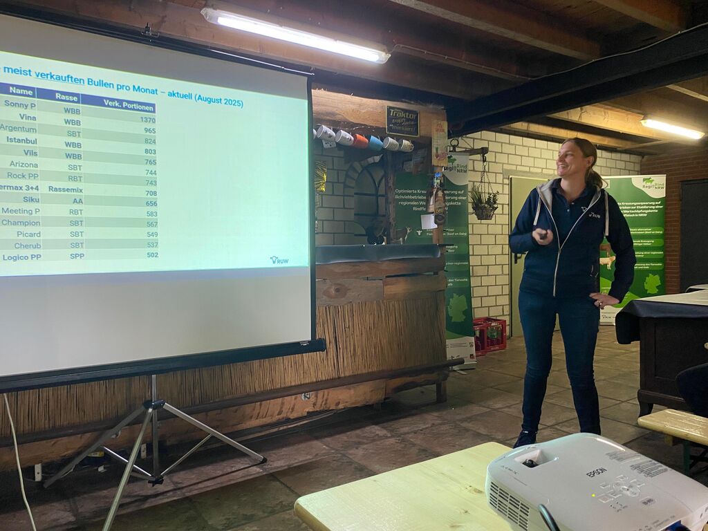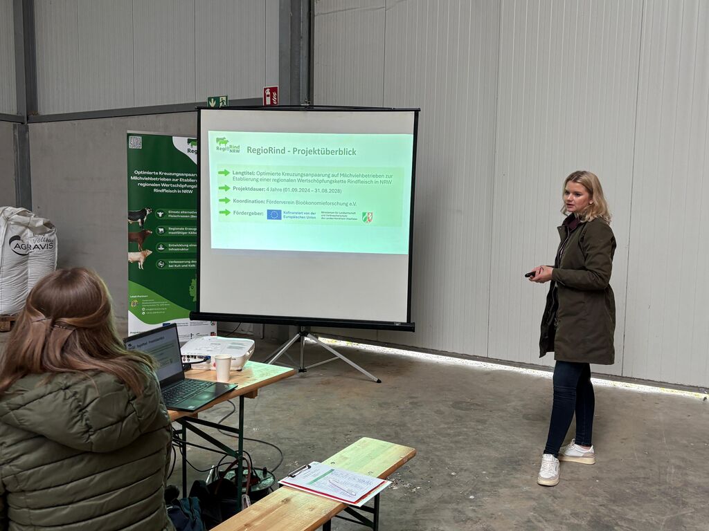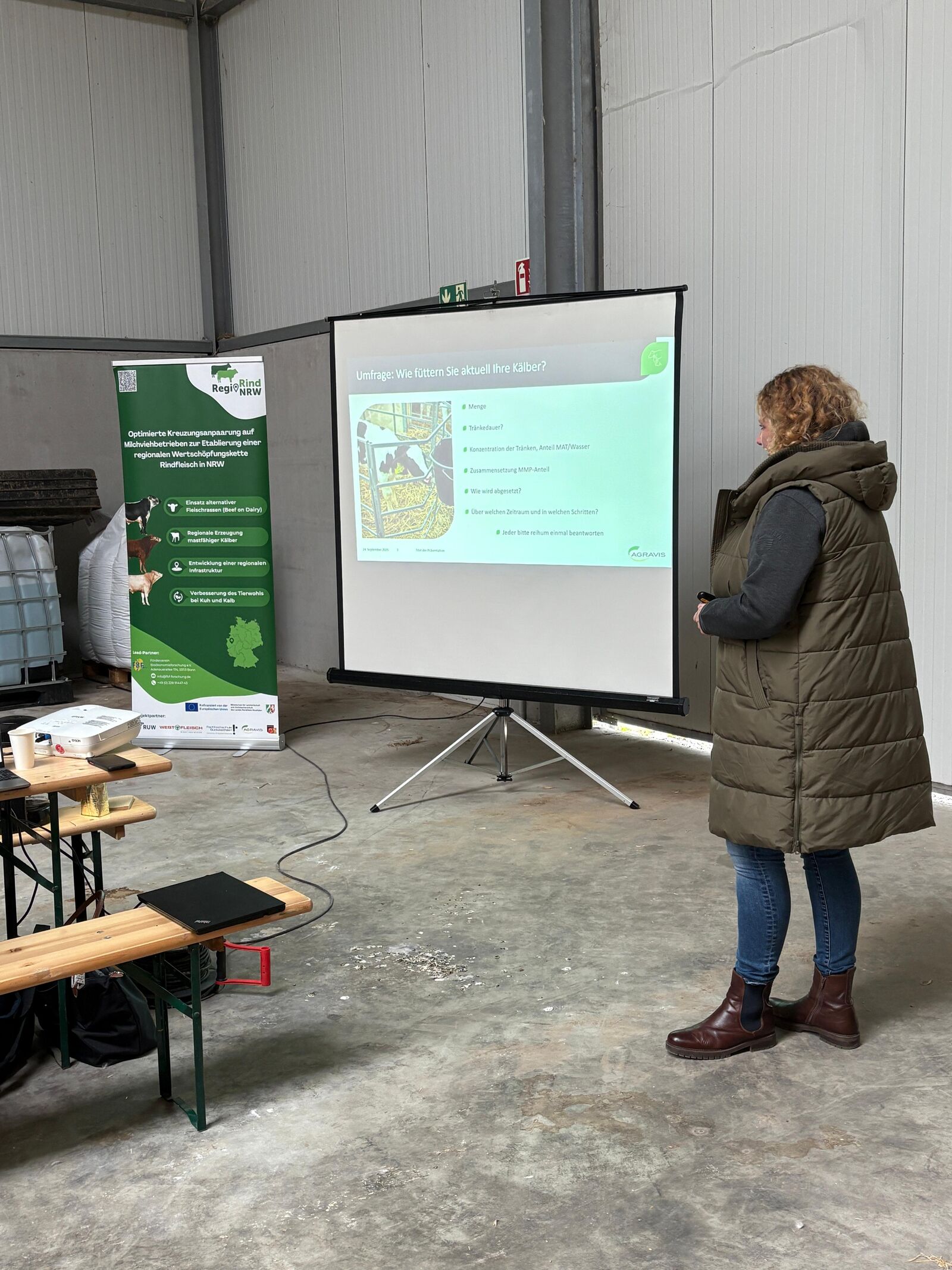 Zunächst stellte der FBF das Projekt „RegioRind NRW“ den teilnehmenden Milchviehbetrieben vor. Ziel ist es, neue Wege für eine tiergerechte, regionale und wirtschaftlich tragfähige Rindfleischerzeugung in Nordrhein-Westfalen aufzuzeigen. Die bislang häufig eingesetzte Rasse Weißblaue Belgier bietet zwar hohe Mastleistungen, ist jedoch aufgrund von Schwergeburtenrisiken und tierschutzrelevanten Aspekten langfristig aus Sicht der Partner nicht zukunftsfähig. Hier setzt „RegioRind NRW“ an: Durch die Erprobung alternativer Fleischrassen in der Milchviehhaltung sollen gut mastfähige für die regionale Bullenmast entstehen, die gleichzeitig auch positiven Eigenschaften für den Milchviehbetrieb mit sich bringen – ein wichtiger Schritt zur Stärkung regionaler Wertschöpfungsketten.
