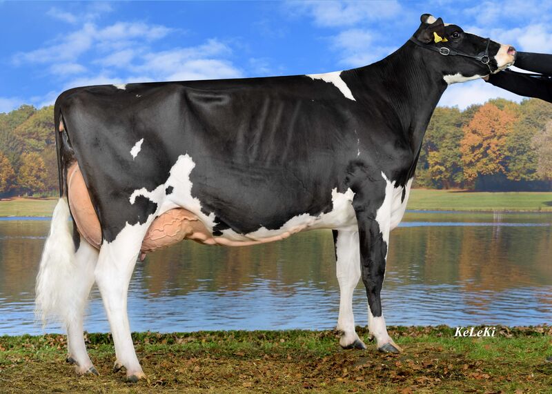 Den Anfang machte der noch junge Numero Uno-Sohn NUGGET RDC. Er wurde von Willsbro Holsteins in Großbritannien gezogen und geht über eine VG 85 Destry RDC x VG 87 Lawn Boy P x VG 89 September RDC x EX 91 Igniter zurück auf die weltberühmte Formation-Tochter Glen Drummond Splendor VG 86. Sein offizieller Zuchtwert beruht zurzeit noch auf genomischer selektierter Grundlage. Töchterbasierte Zuchtwerte erhält NUGGET RDC im Dezember. Die vorgestellten rot- und schwarzbunten Töchter präsentierten sich wie aus einem Guss. Die modernen, eher spätreifen Jungkühe bewegten sich auf hervorragende Fundamente und zeigten feste und hochaufgehängte Euter. Einige Nachzuchtkühe liefen auch im Schauwettbewerb mit. So auch die beste NUGGET RDC-Tochter KOE Tira vom Zuchtbetrieb der Köster KG in Steinfurt, die sich einen beachtenswerten Klassensieg bei den rotbunten Färsen sicherte. Auf den zweiten Platz wurde die harmonische Evalina von Andreas Pröbsting aus Everswinkel vor der typstarken KOE Claude von Thomas Wiethege, Halver, platziert.