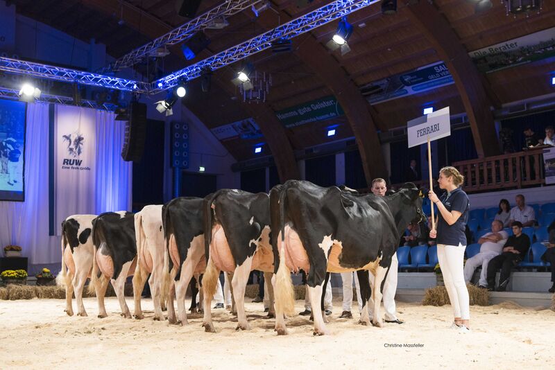 Zum Schluss wurden die FERRARI-Töchter im Ring präsentiert. Der viel genutzte Freddy-Sohn hat sich zu einem Garanten für robuste Laufstallkühe, die sich durch hohe Funktionalität auszeichnen, entwickelt. Die Kollektion bestand aus zwei- und dreikalbigen Töchtern, welche die Qualitäten ihres beliebten Vaters eindrucksvoll verdeutlichten. Die spätreifen, leistungsbereiten und vorrangig dunkel gezeichneten Kühe besaßen sehr hoch aufgehängte Hintereuter, längere Striche, ideal gelagerte Becken und bewegten sich auf soliden und funktionellen Fundamenten. Angeführt wurde die FERRARI-Gruppe von einem auffälligen Duo. Die harmonische Bärbel vom Betrieb Bernhard Bitters aus Hamminkeln wurde vor der stilvollen und noch sehr jugendlich wirkenden Indy aus der Zucht von Ludger Schroeer aus Bocholt platziert. Dritte wurde Fiona aus der Zucht von Tobias Wirtz, Pintesfeld.
