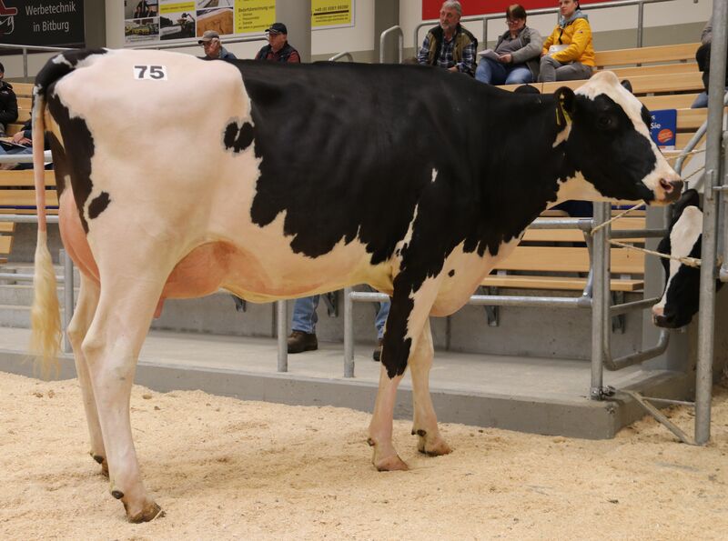 Zurück zur Zwischenüberschrift. So kurz vor Weihnachten darf es auch einmal eine besonders schöne Holsteinfärse sein! Und ja, sie ist etwas ganz Besonderes: PM Monika, eine Casino aus dem Stall Meuteshof eGbR in Rommersheim. Ihre Mutter, NH Mella (v. Aristocrat) und die Großmutter NH Mystery (v. Gymnast) sind hoch bewertete Bullenmütter aus der Zucht Nosbisch mit viel Milch und sehr hohen Inhaltstoffen. Auch PM Monika gibt bereits 45 kg. Eine fehlerfreie Holstein die viele haben wollten. Nach einem langen Bieterduell viel der Hammer bei 5.200 € für einen treuen Kunden aus Viersen. Selber Käufer und Verkäufer: Gleich zu Beginn der Versteigerung kam eine Dublin-Tochter in den Ring, PM Clair aus der tiefen C-Kuhfamilie. Mutter PM Nelli von Barbados hat 87 Punkte und Großmutter PM Naemi von Commander sogar 88 Punkte im Exterieur. Das alles mit 41 kg Milch lies den Preis auf 4.100 € schnellen. Und für diesen Preis verkaufte auch die Zens GbR, Stefan & Matthias, Musweiler eine bestechende Tochter von Driver RDC, ZS Goldfever. Dieser Kuhstamm von Zens hat alles: Seit Generationen hohe Klassifizierungen mit vielen EX-Kühen im Stammbaum, bei hohen Lebensleistungen. Ein Züchter aus Luxemburg erhielt den Zuschlag. Zwei weitere ganz schicke, leistungsstarke Holsteinfärsen stammen ebenfalls vom Meuteshof: Für 3.900 € ersteigerte ein saarländischer Züchter eine weitere Casino mit über 40 kg Tagesleistung und für 3.600 € wechselt eine Maroon PP Tochter nach Luxemburg. Zweimal viel der Hammer bei 3.500 €: Ein Struben Mädel von Husar P, von Stefan Struben aus Dahlem, Käufer aus Luxemburg und im Eifelkreis Bitburg-Prüm bleibt ZS Flieder von Globed P von der Zens GbR aus Musweiler. In der Summe eine gelungene Jahresabschlussauktion in Fließem!