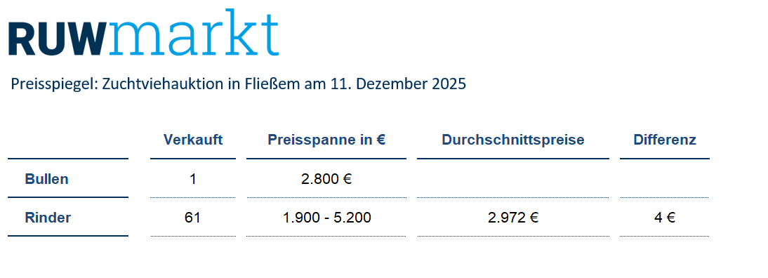 Die nächste Zuchtviehversteigerung in Fließem findet am Donnerstag, den 8. Januar 2026 statt. Anmeldeschluss hierfür ist Montag, 22. Dezember 2025. Transportmöglichkeiten in alle Regionen, gewissenhafte Erfüllung von Kaufaufträgen, Kataloge und nähere Informationen erhalten Sie bei der Rinder-Union West eG, Hamerter Berg 1, 54636 Fließem, Tel. 06569 9690-20 Fax 9690-99. E-Mail: mmertes@ruweg.de oder www.ruweg.de.