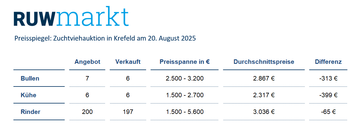 Die nächste Zuchtviehauktion der Rinder-Union West eG in Krefeld findet am 17. September 2025 statt. Anmeldungen für diese Auktion sollten bis Freitag, 29. August 2025, im RUW-Regionalzentrum in Krefeld vorliegen und werden unter Tel. 02151-81899-14, per Fax 02151-81899-66 oder per Mail aleuchten@ruweg.de entgegengenommen. Für einen reibungslosen Ablauf bitten wir um Einhaltung der Anmeldefrist.