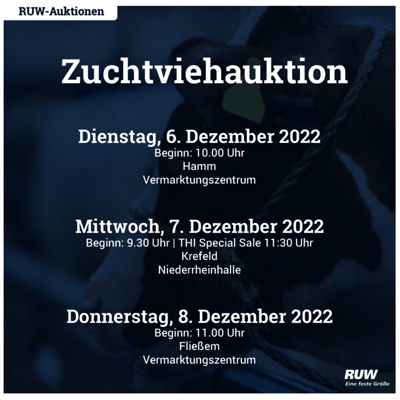 Am Mittwoch, den 07.12.2022, folgt die Auktion in der Niederrheinhalle in Krefeld mit gut 25 Deckbullen und ca. 240 abgekalbten Färsen und Kühen. Bitte beachten Sie den vorgezogenen Start der Auktion um 09:30 Uhr. Um 11:30 beginnt dann der THI SPECIAL SALE mit einem Angebot von 70 ausgewählten Tieren und Embryonenpaketen. Die Zuchtstätte Thoenes Holstein International bietet erstklassige Genetik aus Top-Kuhfamilien mit hohen Zuchtwerten und sehr gutem Exterieur zum Verkauf an. Die Auktion kann online mitverfolgt und Gebote können online abgegeben werden. Bitte registrieren Sie sich vorab unter auktion.ruweg.de.